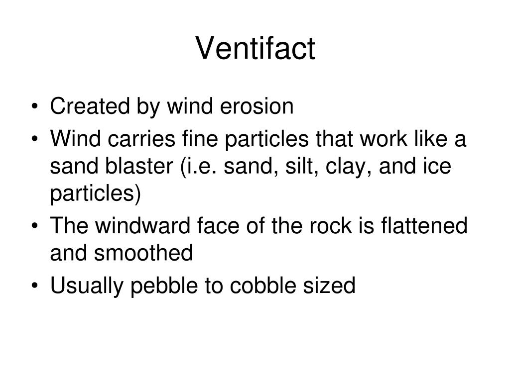 Ventifact • Created by wind erosion • Wind carries fine particles that work like a sand blaster (i.e. sand, silt, clay, and ice particles) • The windward face of the rock is flattened and smoothed • Usually pebble to cobble sized