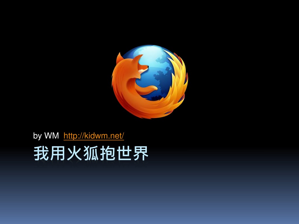 by WM http://kidwm.net/. 我用火狐抱世界. WM ?. 非常不專業的網路與網頁技術愛好者 接觸的動力是為了維護自己的網站 與經營一個跟大家一起交流的社區 然後就一頭栽進來了 國立交通大學校園網路策進會 第 16 屆會長 過沒多久要去當大頭兵了. 講啥?. 入教的經過 堅定的信仰 向他人佈教 編寫福音書 追求真善美. 入教的經過. 萬惡的 Internet Explorer 6 ( 泡網才 7 年,家裏開始上網時就是 XP 系統 ) Maxthon 傲遊 ( 不過傲遊 3 投靠更邪惡的 Webkit 陣營了 )