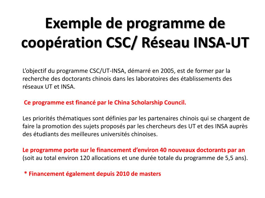 Exemple de programme de coopération CSC/ Réseau INSA-UT L’objectif du programme CSC/UT-INSA, démarré en 2005, est de former par la recherche des doctorants chinois dans les laboratoires des établissements des réseaux UT et INSA. Ce programme est financé par le China Scholarship Council. Les priorités thématiques sont définies par les partenaires chinois qui se chargent de faire la promotion des sujets proposés par les chercheurs des UT et des INSA auprès des étudiants des meilleures universités chinoises. Le programme porte sur le financement d’environ 40 nouveaux doctorants par an (soit au total environ 120 allocations et une durée totale du programme de 5,5 ans). * Financement également depuis 2010 de masters