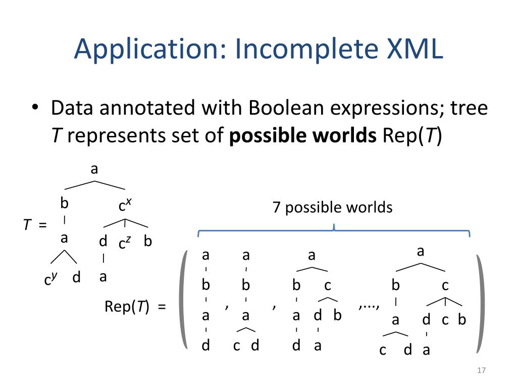 Application: Incomplete XML • Data annotated with Boolean expressions; tree T represents set of possible worlds Rep(T) a a 7 possible worlds b c b cx T = a d b a cz d b a d a a a a cy d b c b b , , ,..., Rep(T) = a d c b a a c d a d c d