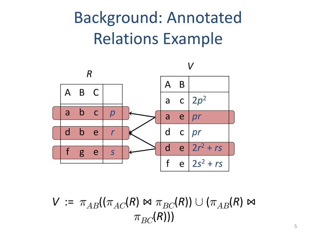 Background: Annotated Relations Example V R V := ¼AB((¼AC(R) ⋈ ¼BC(R)) [ (¼AB(R) ⋈ ¼BC(R)))