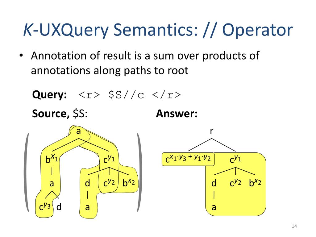 K-UXQuery Semantics: // Operator • Annotation of result is a sum over products of annotations along paths to root Query:<r> $S//c </r> Source, $S: Answer: a r cx1¢y3 + y1¢y2 bx1 cy1 cy1 a d cy2 bx2 d cy2 bx2 cy3 d a a