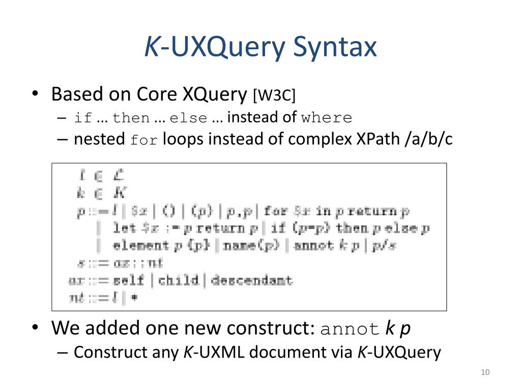 K-UXQuery Syntax • Based on Core XQuery [W3C] • if ... then ... else ... instead of where • nested for loops instead of complex XPath /a/b/c • We added one new construct: annotk p • Construct any K-UXML document via K-UXQuery