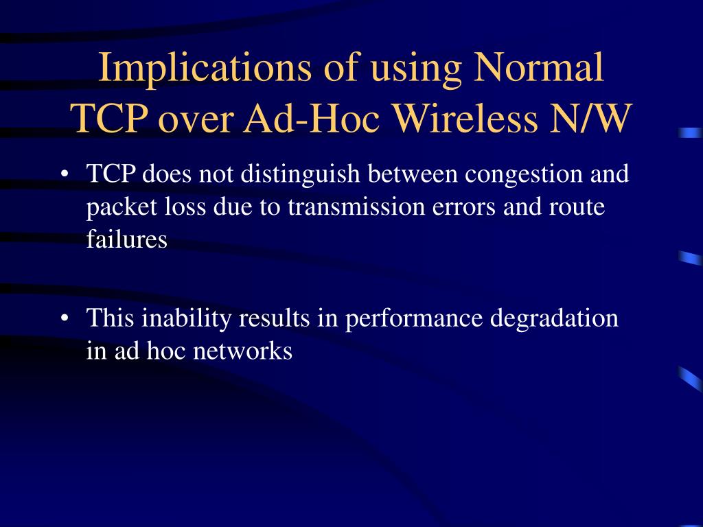 Implications of using Normal TCP over Ad-Hoc Wireless N/W • TCP does not distinguish between congestion and packet loss due to transmission errors and route failures • This inability results in performance degradation in ad hoc networks