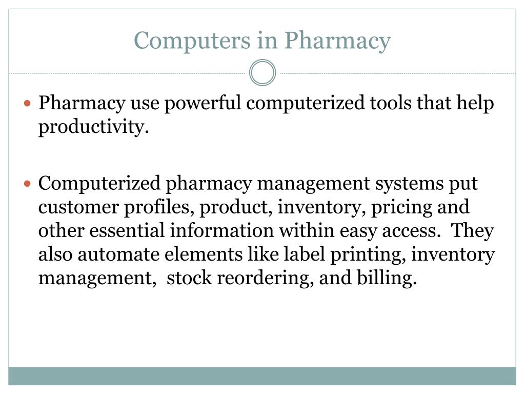 Computers in Pharmacy Pharmacy use powerful computerized tools that help productivity. Computerized pharmacy management systems put customer profiles, product, inventory, pricing and other essential information within easy access. They also automate elements like label printing, inventory management, stock reordering, and billing.