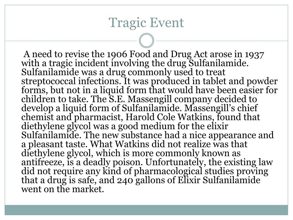 Tragic Event A need to revise the 1906 Food and Drug Act arose in 1937 with a tragic incident involving the drug Sulfanilamide. Sulfanilamide was a drug commonly used to treat streptococcal infections. It was produced in tablet and powder forms, but not in a liquid form that would have been easier for children to take. The S.E. Massengill company decided to develop a liquid form of Sulfanilamide. Massengill’s chief chemist and pharmacist, Harold Cole Watkins, found that diethylene glycol was a good medium for the elixir Sulfanilamide. The new substance had a nice appearance and a pleasant taste. What Watkins did not realize was that diethylene glycol, which is more commonly known as antifreeze, is a deadly poison. Unfortunately, the existing law did not require any kind of pharmacological studies proving that a drug is safe, and 240 gallons of Elixir Sulfanilamide went on the market.