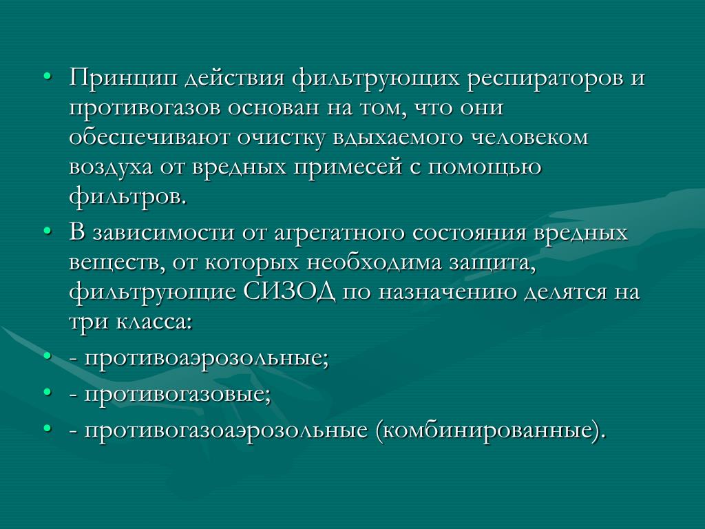 Принцип действия фильтрующих респираторов и противогазов основан на том, что они обеспечивают очистку вдыхаемого человеком воздуха от вредных примесей с помощью фильтров. • В зависимости от агрегатного состояния вредных веществ, от которых необходима защита, фильтрующие СИЗОД по назначению делятся на три класса: • - противоаэрозольные; • - противогазовые; • - противогазоаэрозольные (комбинированные).