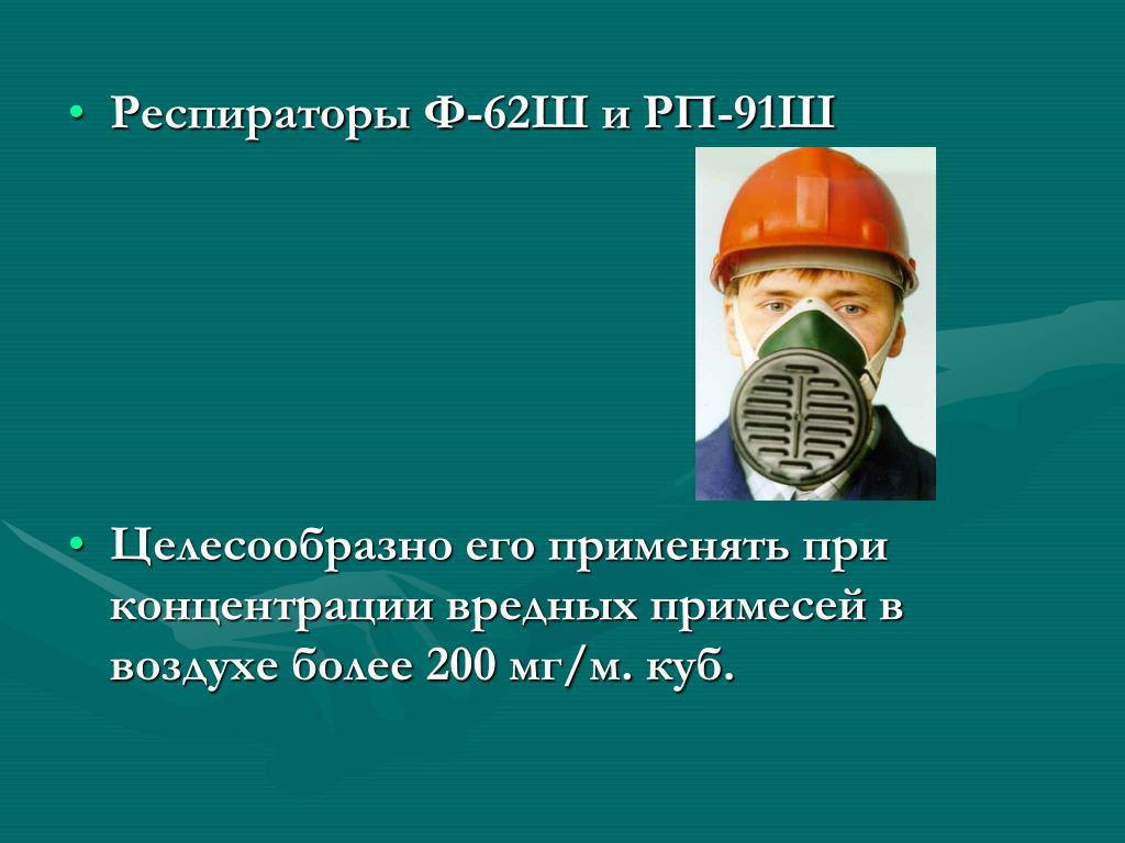 Респираторы Ф-62Ш и РП-91Ш • Целесообразно его применять при концентрации вредных примесей в воздухе более 200 мг/м. куб.