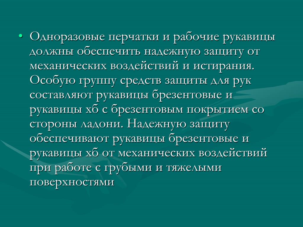 Одноразовые перчатки и рабочие рукавицы должны обеспечить надежную защиту от механических воздействий и истирания. Особую группу средств защиты для рук составляют рукавицы брезентовые и рукавицы хб с брезентовым покрытием со стороны ладони. Надежную защиту обеспечивают рукавицы брезентовые и рукавицы хб от механических воздействий при работе с грубыми и тяжелыми поверхностями