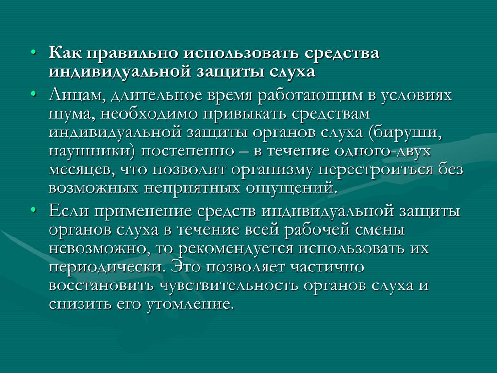 Как правильно использовать средства индивидуальной защиты слуха • Лицам, длительное время работающим в условиях шума, необходимо привыкать средствам индивидуальной защиты органов слуха (бируши, наушники) постепенно – в течение одного-двух месяцев, что позволит организму перестроиться без возможных неприятных ощущений. • Если применение средств индивидуальной защиты органов слуха в течение всей рабочей смены невозможно, то рекомендуется использовать их периодически. Это позволяет частично восстановить чувствительность органов слуха и снизить его утомление.