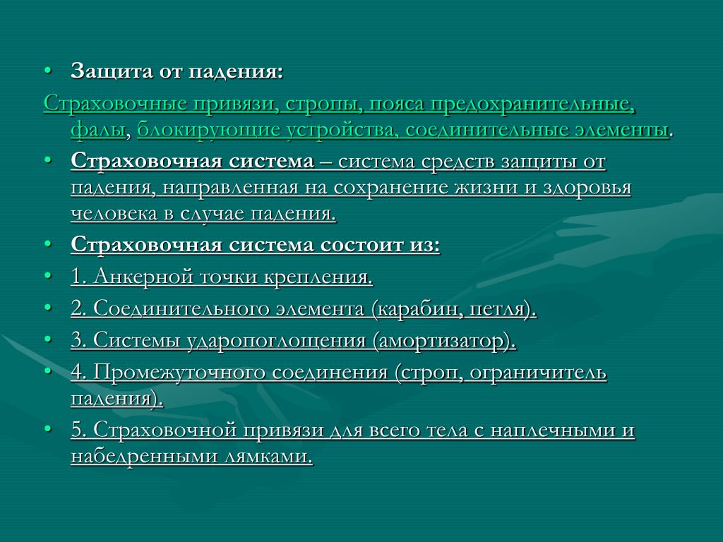 Защита от падения: Cтраховочные привязи, стропы, пояса предохранительные, фалы, блокирующие устройства, соединительные элементы. • Страховочная система – система средств защиты от падения, направленная на сохранение жизни и здоровья человека в случае падения. • Страховочная система состоит из: • 1. Анкерной точки крепления. • 2. Соединительного элемента (карабин, петля). • 3. Системы ударопоглощения (амортизатор). • 4. Промежуточного соединения (строп, ограничитель падения). • 5. Страховочной привязи для всего тела с наплечными и набедренными лямками.
