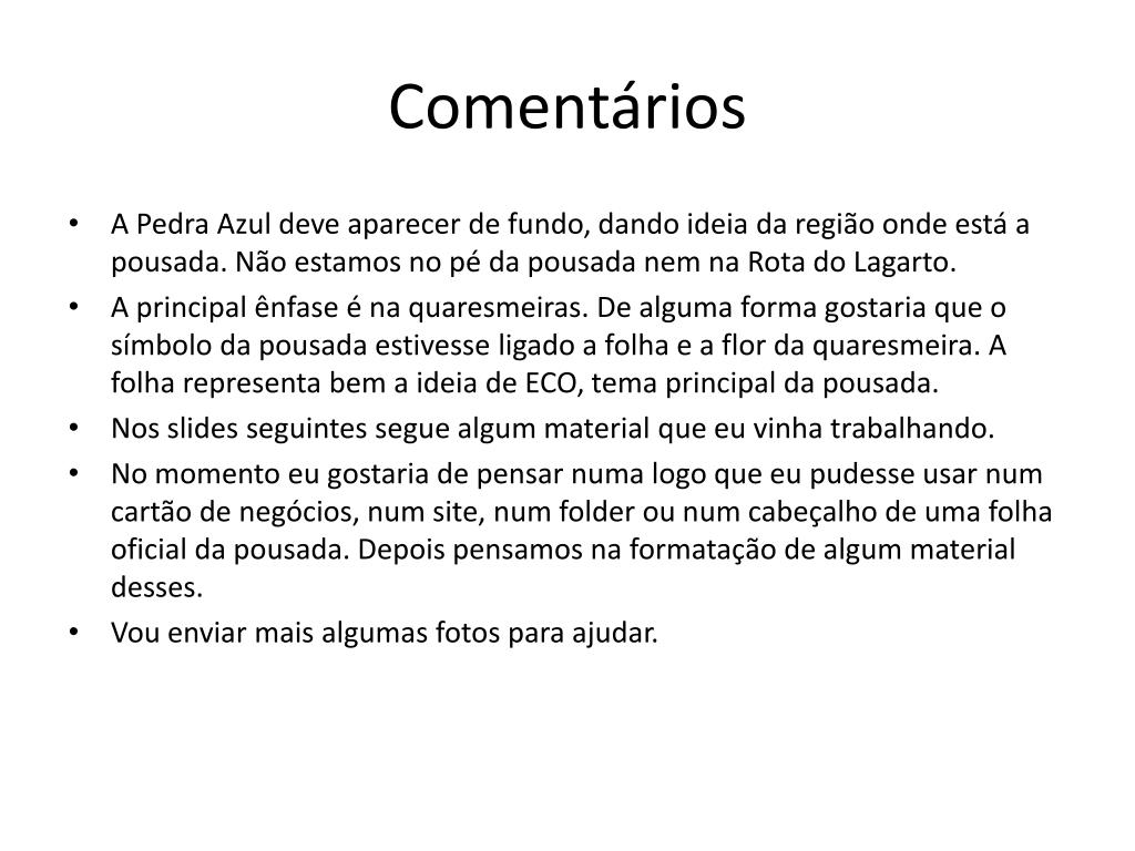Comentários • A Pedra Azul deve aparecer de fundo, dando ideia da região onde está a pousada. Não estamos no pé da pousada nem na Rota do Lagarto. • A principal ênfase é na quaresmeiras. De alguma forma gostaria que o símbolo da pousada estivesse ligado a folha e a flor da quaresmeira. A folha representa bem a ideia de ECO, tema principal da pousada. • Nos slides seguintes segue algum material que eu vinha trabalhando. • No momento eu gostaria de pensar numa logo que eu pudesse usar num cartão de negócios, num site, num folder ou num cabeçalho de uma folha oficial da pousada. Depois pensamos na formatação de algum material desses. • Vou enviar mais algumas fotos para ajudar.