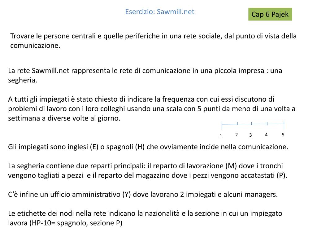 Esercizio: Sawmill.net Cap 6 Pajek Trovare le persone centrali e quelle periferiche in una rete sociale, dal punto di vista della comunicazione. La rete Sawmill.net rappresenta le rete di comunicazione in unapiccolaimpresa : unasegheria. A tuttigliimpiegati è statochiesto di indicare la frequenza con cui essidiscutono di problemi di lavoro con i lorocolleghiusandounascala con 5 punti da meno di unavolta a settimana a diverse volte al giorno. Gliimpiegatisonoinglesi (E) o spagnoli (H) cheovviamenteincidenellacomunicazione. La segheriacontiene due repartiprincipali: ilreparto di lavorazione (M) dove i tronchivengonotagliati a pezzi e ilreparto del magazzino dove i pezzivengonoaccatastati (P). C’èinfine un ufficioamministrativo (Y) dove lavorano 2 impiegatie alcuni managers. Le etichettedeinodinella rete indicano la nazionalità e la sezione in cui un impiegatolavora (HP-10= spagnolo, sezione P) 2 4 5 3 1