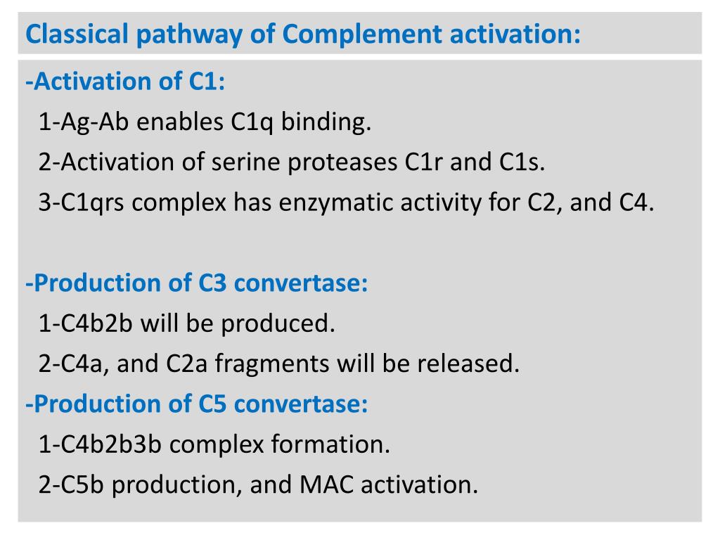 Classical pathway of Complement activation: -Activation of C1: 1-Ag-Ab enables C1q binding. 2-Activation of serine proteases C1r and C1s. 3-C1qrs complex has enzymatic activity for C2, and C4. -Production of C3 convertase: 1-C4b2b will be produced. 2-C4a, and C2a fragments will be released. -Production of C5 convertase: 1-C4b2b3b complex formation. 2-C5b production, and MAC activation.