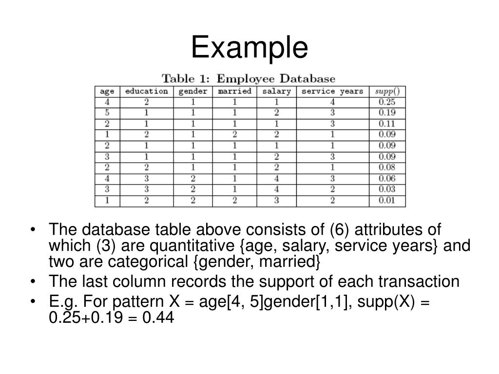 Example • The database table above consists of (6) attributes of which (3) are quantitative {age, salary, service years} and two are categorical {gender, married} • The last column records the support of each transaction • E.g. For pattern X = age[4, 5]gender[1,1], supp(X) = 0.25+0.19 = 0.44