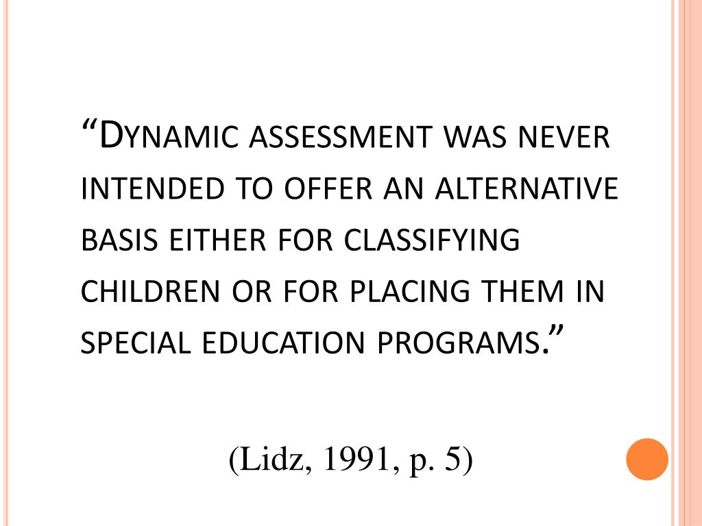 “Dynamic assessment was never intended to offer an alternative basis either for classifying children or for placing them in special education programs.” (Lidz, 1991, p. 5)