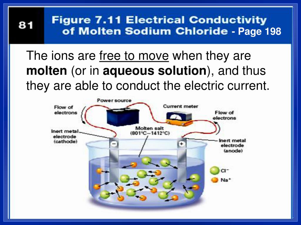- Page 198 The ions are free to move when they are molten (or in aqueous solution), and thus they are able to conduct the electric current.