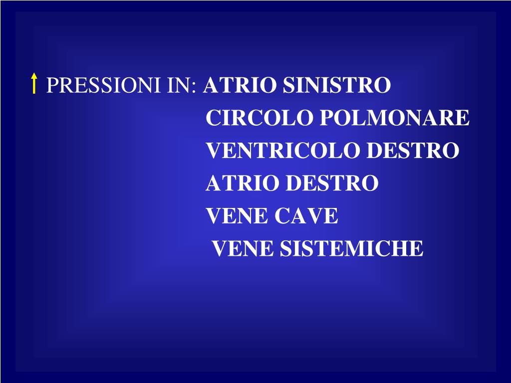 PRESSIONI IN: ATRIO SINISTRO CIRCOLO POLMONARE VENTRICOLO DESTRO ATRIO DESTRO VENE CAVE VENE SISTEMICHE