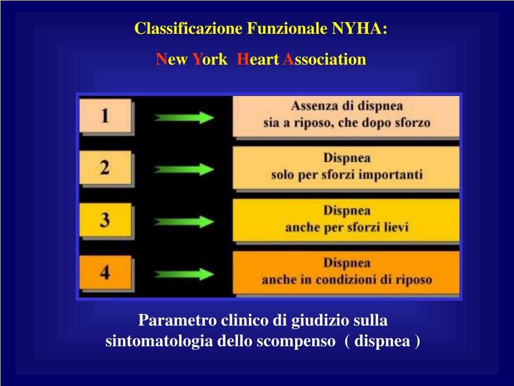 Classificazione Funzionale NYHA: New York Heart Association Parametro clinico di giudizio sulla sintomatologia dello scompenso ( dispnea )