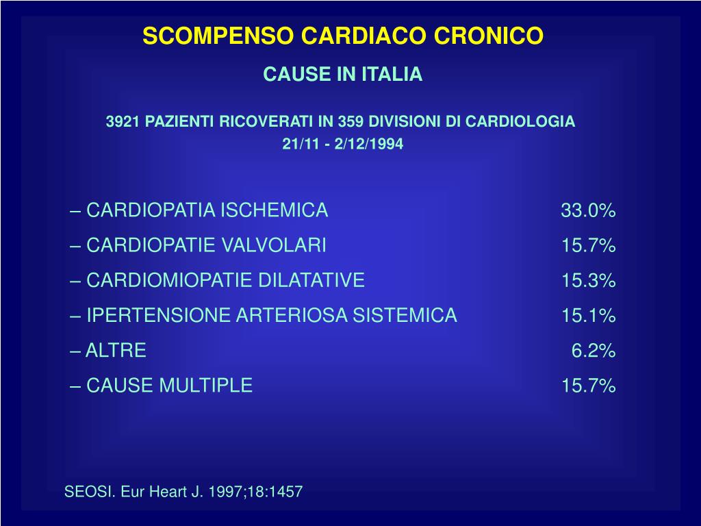 SCOMPENSO CARDIACO CRONICO CAUSE IN ITALIA 3921 PAZIENTI RICOVERATI IN 359 DIVISIONI DI CARDIOLOGIA 21/11 - 2/12/1994 • CARDIOPATIA ISCHEMICA 33.0% • CARDIOPATIE VALVOLARI 15.7% • CARDIOMIOPATIE DILATATIVE 15.3% • IPERTENSIONE ARTERIOSA SISTEMICA 15.1% • ALTRE 6.2% • CAUSE MULTIPLE 15.7% SEOSI. Eur Heart J. 1997;18:1457