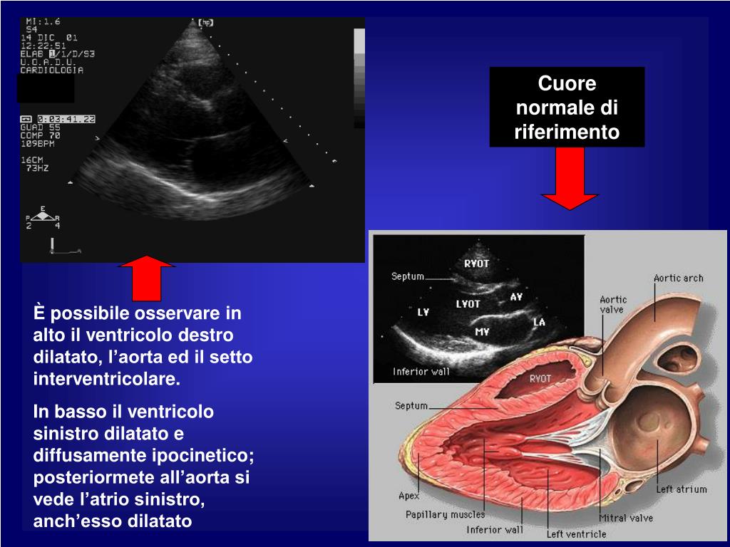 Cuore normale di riferimento È possibile osservare in alto il ventricolo destro dilatato, l’aorta ed il setto interventricolare. In basso il ventricolo sinistro dilatato e diffusamente ipocinetico; posteriormete all’aorta si vede l’atrio sinistro, anch’esso dilatato
