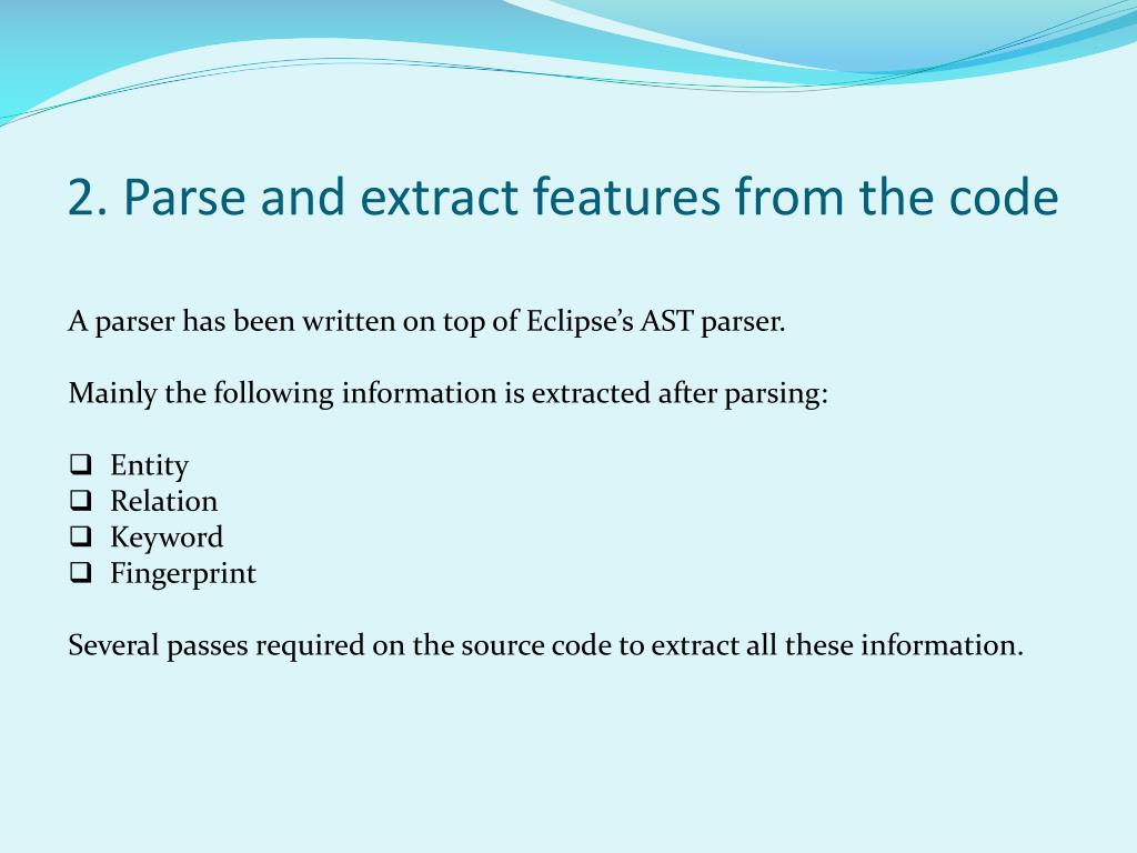 2. Parse and extract features from the code A parser has been written on top of Eclipse’s AST parser. Mainly the following information is extracted after parsing: • Entity • Relation • Keyword • Fingerprint Several passes required on the source code to extract all these information.