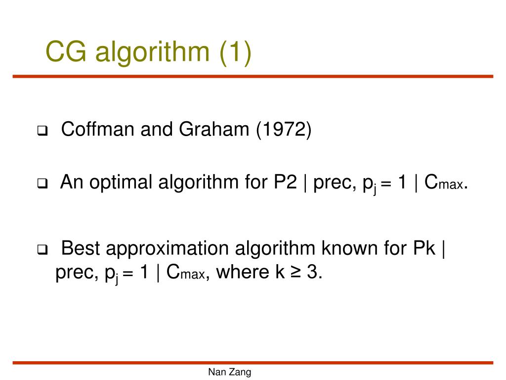 CG algorithm (1) • Coffman and Graham (1972) • An optimal algorithm for P2 | prec, pj = 1 | Cmax. • Best approximation algorithm known for Pk | prec, pj = 1 | Cmax, where k ≥ 3. Nan Zang