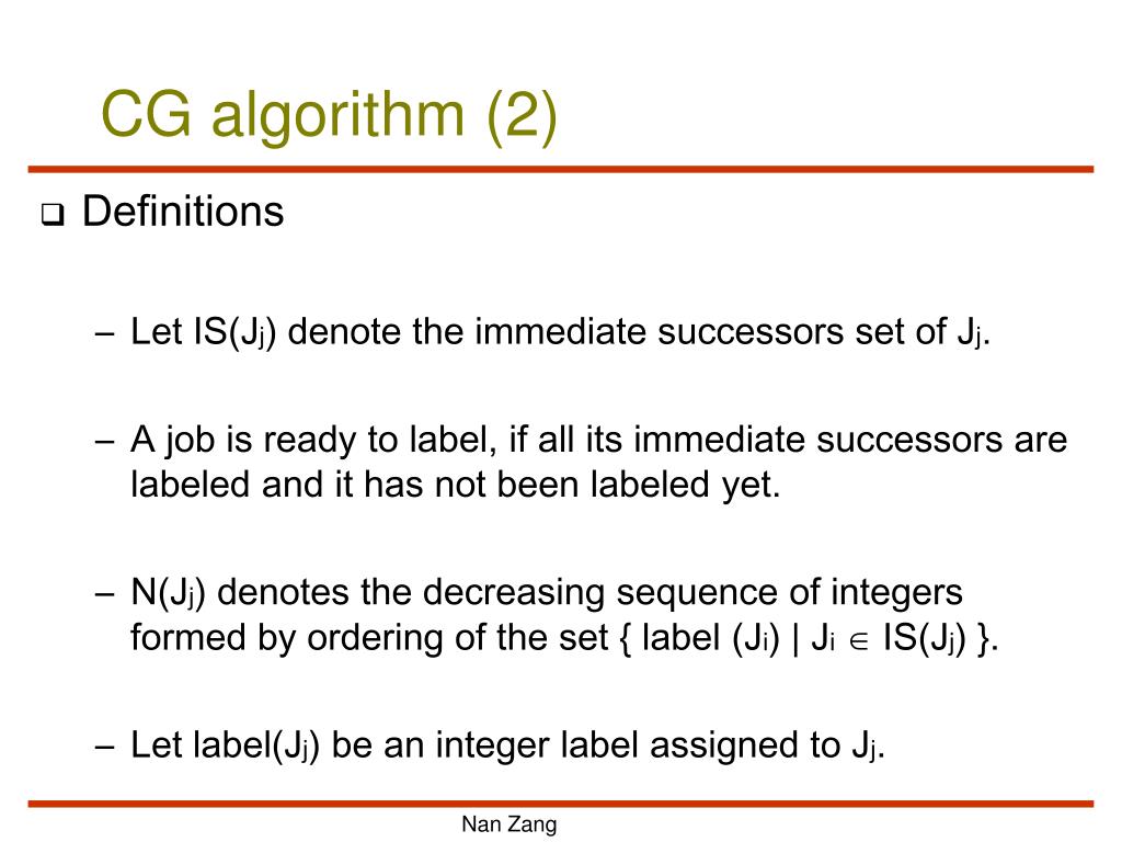 CG algorithm (2) • Definitions • Let IS(Jj) denote the immediate successors set of Jj. • A job is ready to label, if all its immediate successors are labeled and it has not been labeled yet. • N(Jj) denotes the decreasing sequence of integers formed by ordering of the set { label (Ji) | Ji IS(Jj) }. • Let label(Jj) be an integer label assigned to Jj. Nan Zang