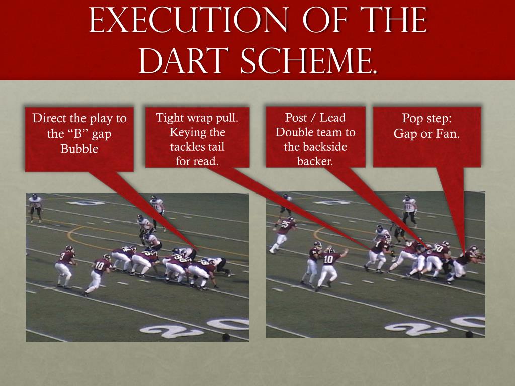 Execution of the dart scheme. Direct the play to the “B” gap Bubble Tight wrap pull. Keying the tackles tail for read. Post / Lead Double team to the backside backer. Pop step: Gap or Fan.