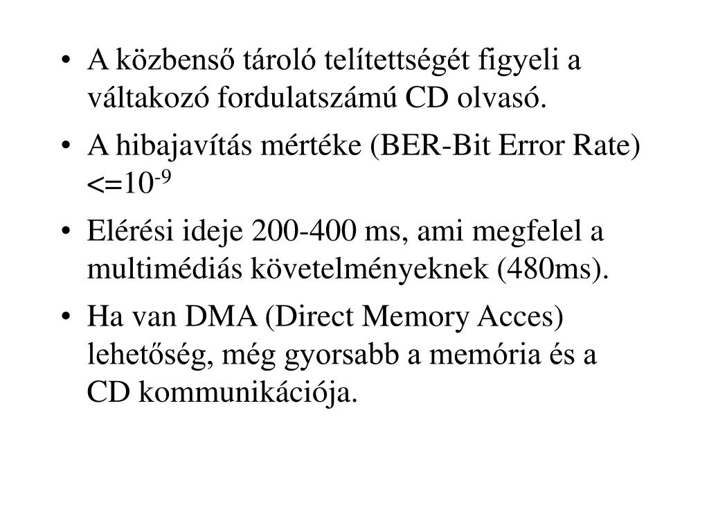 A közbenső tároló telítettségét figyeli a váltakozó fordulatszámú CD olvasó. • A hibajavítás mértéke (BER-Bit Error Rate) <=10-9 • Elérési ideje 200-400 ms, ami megfelel a multimédiás követelményeknek (480ms). • Ha van DMA (Direct Memory Acces) lehetőség, még gyorsabb a memória és a CD kommunikációja.
