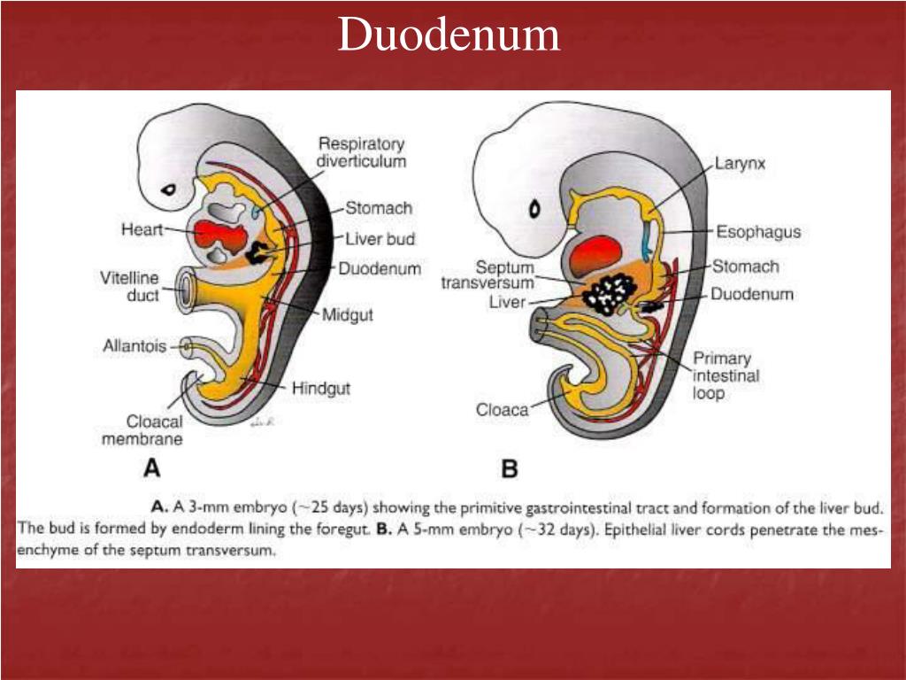 DEVELOPMENT OF THE DUODENUM • Early in the 4th week, the duodenum develops from the endoderm of primordial gut of the: • Caudal part of foregut. • Cranial part of midgut & from :Splanchnic mesoderm. • The junction of the 2 parts of the gut lies just below or distal to the origin of bile duct (C &D). 4th week 5th week