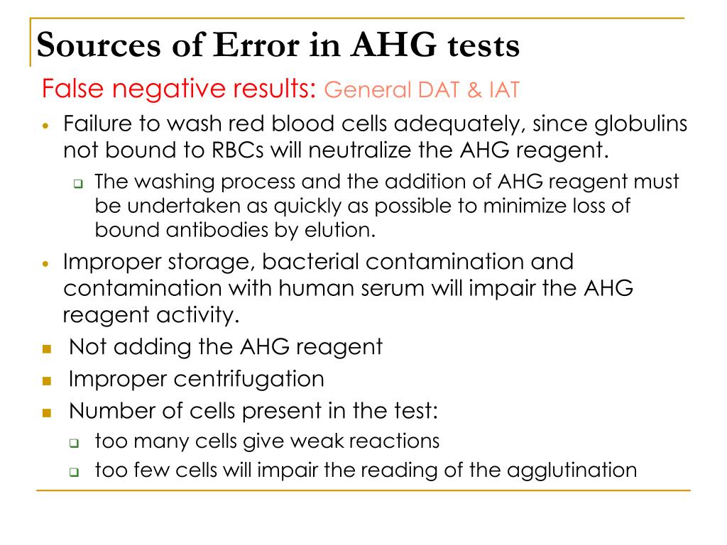 Sources of Error in AHG tests False negative results: General DAT & IAT • Failure to wash red blood cells adequately, since globulins not bound to RBCs will neutralize the AHG reagent. • The washing process and the addition of AHG reagent must be undertaken as quickly as possible to minimize loss of bound antibodies by elution. • Improper storage, bacterial contamination and contamination with human serum will impair the AHG reagent activity. • Not adding the AHG reagent • Improper centrifugation • Number of cells present in the test: • too many cells give weak reactions • too few cells will impair the reading of the agglutination