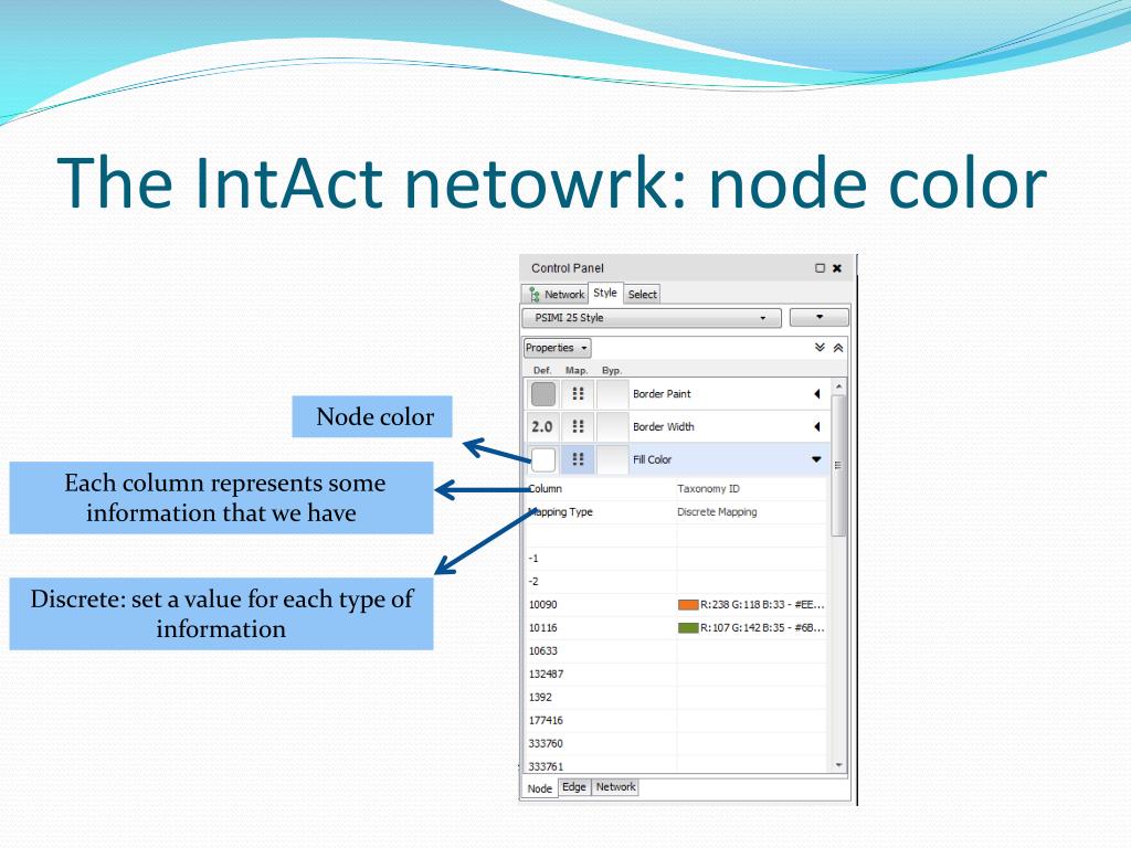 The IntActnetowrk: node color Node color Each column represents some information that we have Discrete: set a value for each type of information