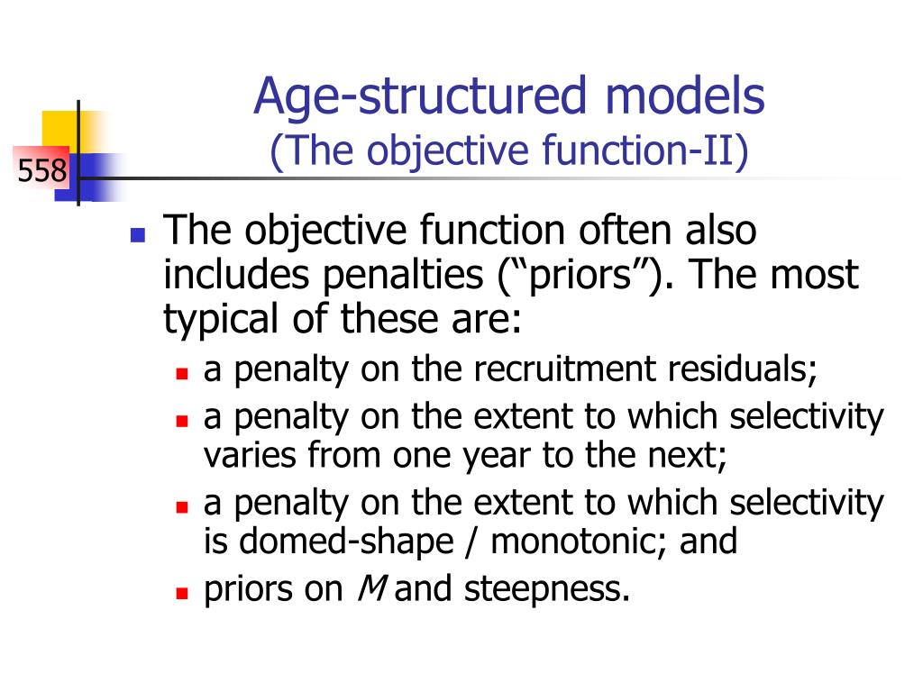 Age-structured models(The objective function-II) • The objective function often also includes penalties (“priors”). The most typical of these are: • a penalty on the recruitment residuals; • a penalty on the extent to which selectivity varies from one year to the next; • a penalty on the extent to which selectivity is domed-shape / monotonic; and • priors on M and steepness.