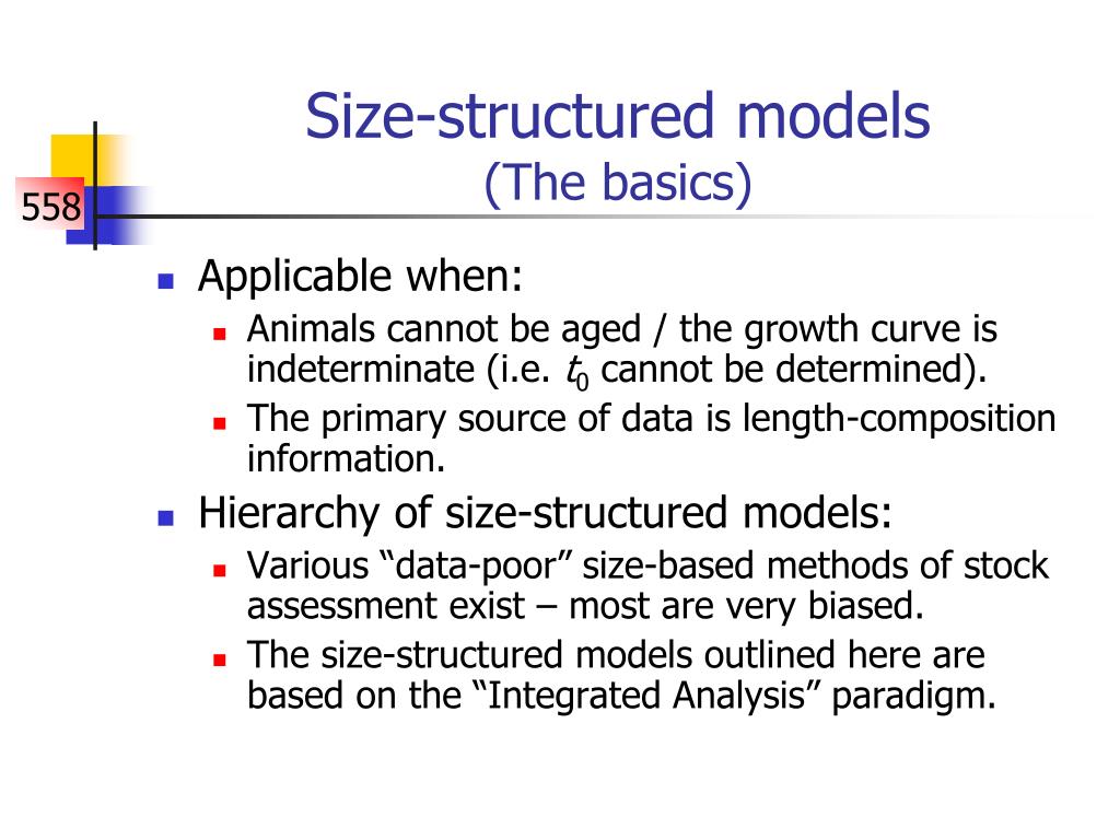 Size-structured models(The basics) • Applicable when: • Animals cannot be aged / the growth curve is indeterminate (i.e. t0 cannot be determined). • The primary source of data is length-composition information. • Hierarchy of size-structured models: • Various “data-poor” size-based methods of stock assessment exist – most are very biased. • The size-structured models outlined here are based on the “Integrated Analysis” paradigm.