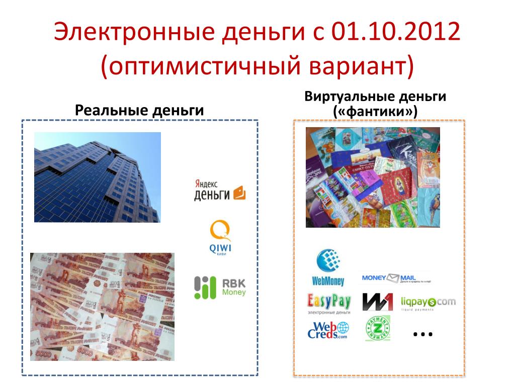 Электронные деньги с 01.10.2012(оптимистичный вариант) Реальные деньги Виртуальные деньги(«фантики») …