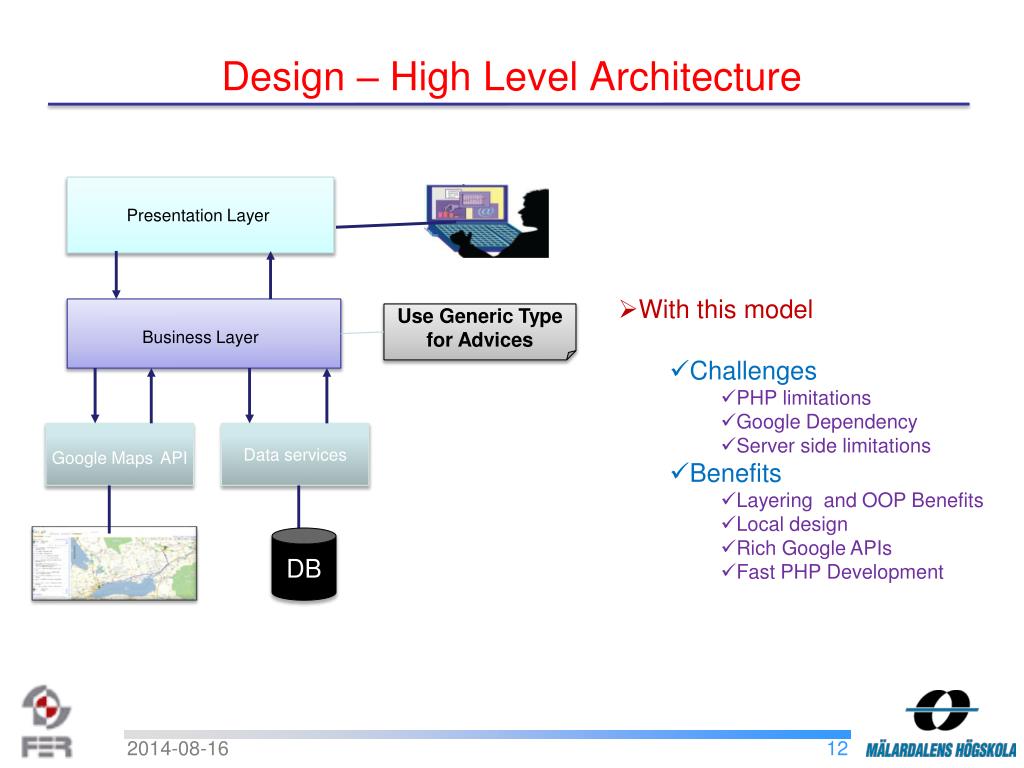 Presentation Layer Business Layer Google MapsAPI Data services Design – High Level Architecture • With this model • Challenges • PHP limitations • Google Dependency • Server side limitations • Benefits • Layering and OOP Benefits • Local design • Rich Google APIs • Fast PHP Development Use Generic Type for Advices DB 2014-08-16 12