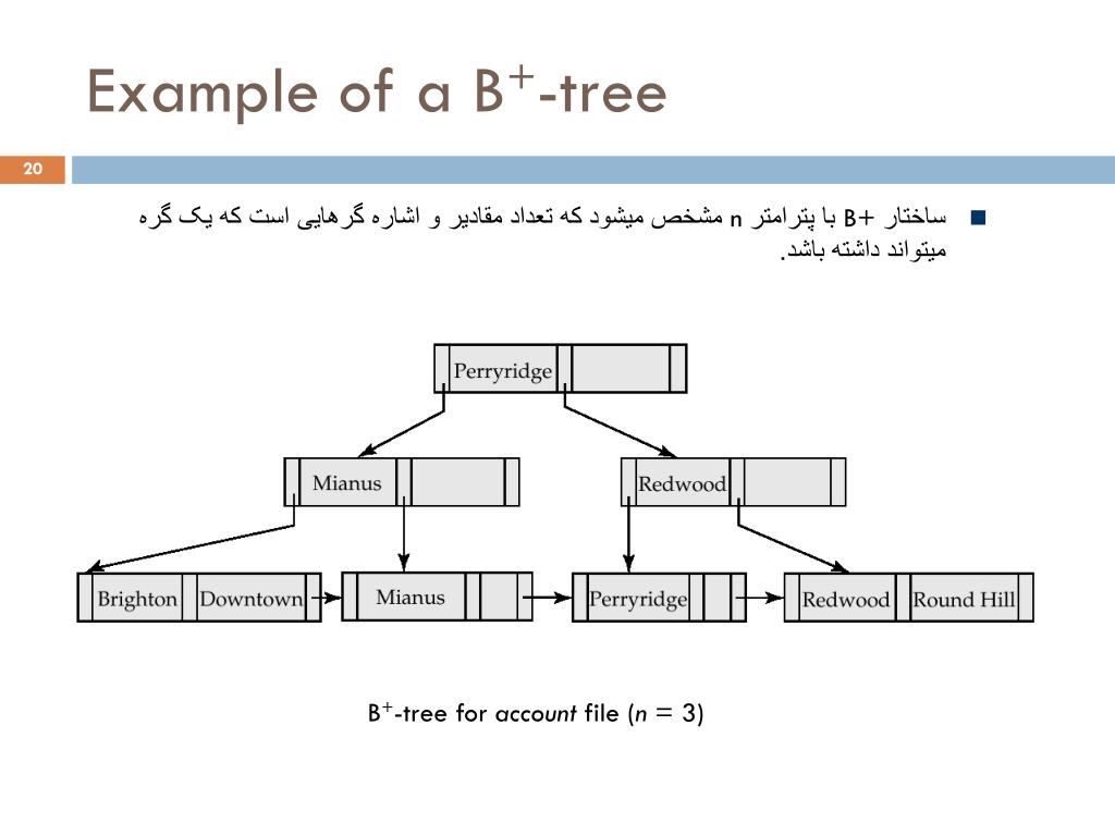 Example of a B+-tree • ساختار B+ با پترامتر n مشخص میشود که تعداد مقادیر و اشاره گرهایی است که یک گره میتواند داشته باشد. B+-tree for account file (n = 3)