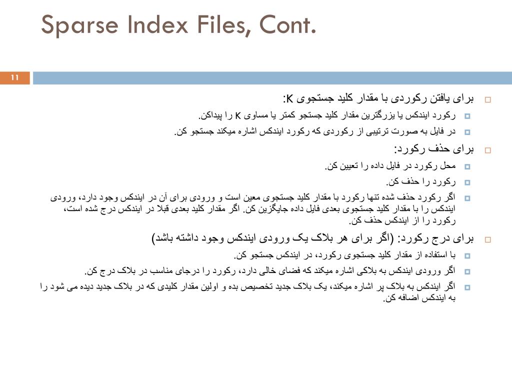 Dense Index Files, Cont. • برای یافتن رکورد(ها)ی که مقدار کلید جستجوی آن K است: • رکورد ایندکس با مقدار کلید جستجوی K را پیدا کن. • اشاره گر از رکورد ایندکس به رکورد(ها)ی داده را دنبال کن. • برای حذف یک رکورد: • مکان رکورد را در فایل داده تعیین کن. • رکورد را از فایل داده حذف کن. • اگر رکورد حذف شده تنها رکورد با مقدار کلید جستجوی موردنظر باشد، کلید جستجو از ایندکس حذف میشود. • برای درج رکورد: • بااستفاده از مقدار کلید جستجو، در ایندکس جستجو کن. • اگر مقدار کلید جستجو در ایندکس وجودندارد، آن را درج کن. • رکورد را در فایل داده درج کن. (در مکان صحیح) • اشاره گری از ورودی ایندکس به رکورد داده ایجاد کن.