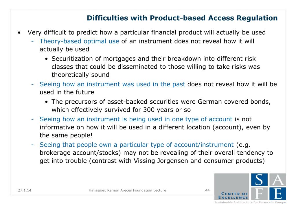 Difficulties with Product-based Access Regulation • Very difficult to predict how a particular financial product will actually be used • Theory-based optimal use of an instrument does not reveal how it will actually be used • Securitization of mortgages and their breakdown into different risk classes that could be disseminated to those willing to take risks was theoretically sound • Seeing how an instrument was used in the past does not reveal how it will be used in the future • The precursors of asset-backed securities were German covered bonds, which effectively survived for 300 years or so • Seeing how an instrument is being used in one type of account is not informative on how it will be used in a different location (account), even by the same people! • Seeing that people own a particular type of account/instrument (e.g. brokerage account/stocks) may not be revealing of their overall tendency to get into trouble (contrast with Vissing Jorgensen and consumer products) Haliassos, Ramon Areces Foundation Lecture