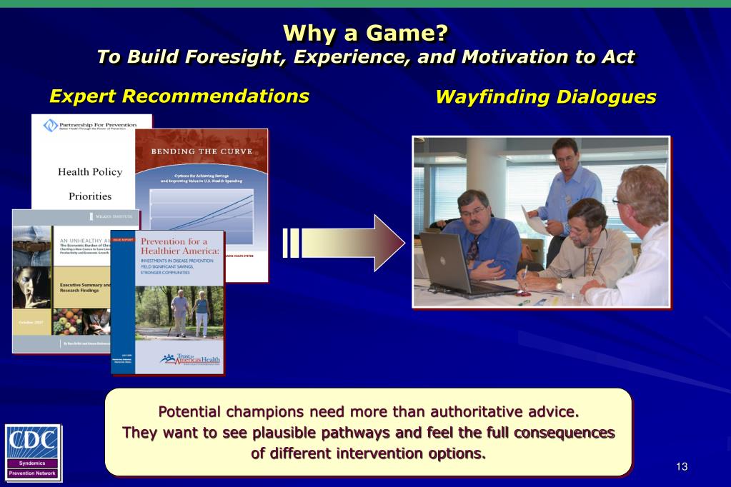 Why a Game?To Build Foresight, Experience, and Motivation to Act Expert Recommendations Wayfinding Dialogues Potential champions need more than authoritative advice. They want to see plausible pathways and feel the full consequences of different intervention options.