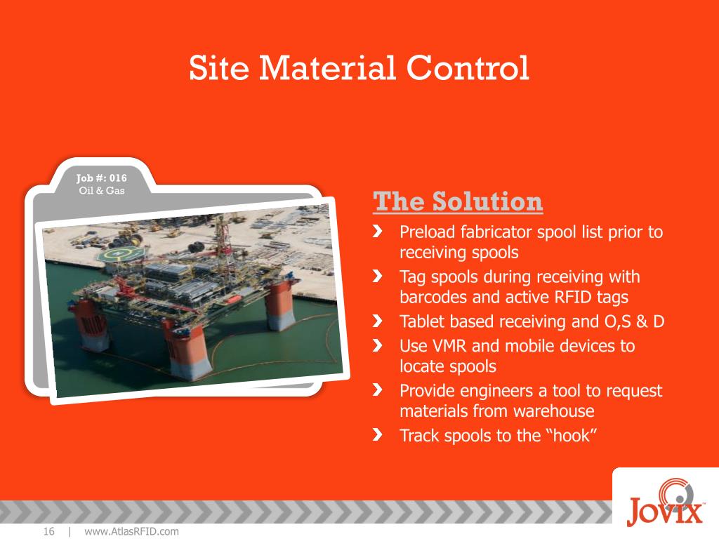 Site Material Control Job #: 016 Oil & Gas The Solution • Preload fabricator spool list prior to receiving spools • Tag spools during receiving with barcodes and active RFID tags • Tablet based receiving and O,S & D • Use VMR and mobile devices to locate spools • Provide engineers a tool to request materials from warehouse • Track spools to the “hook”