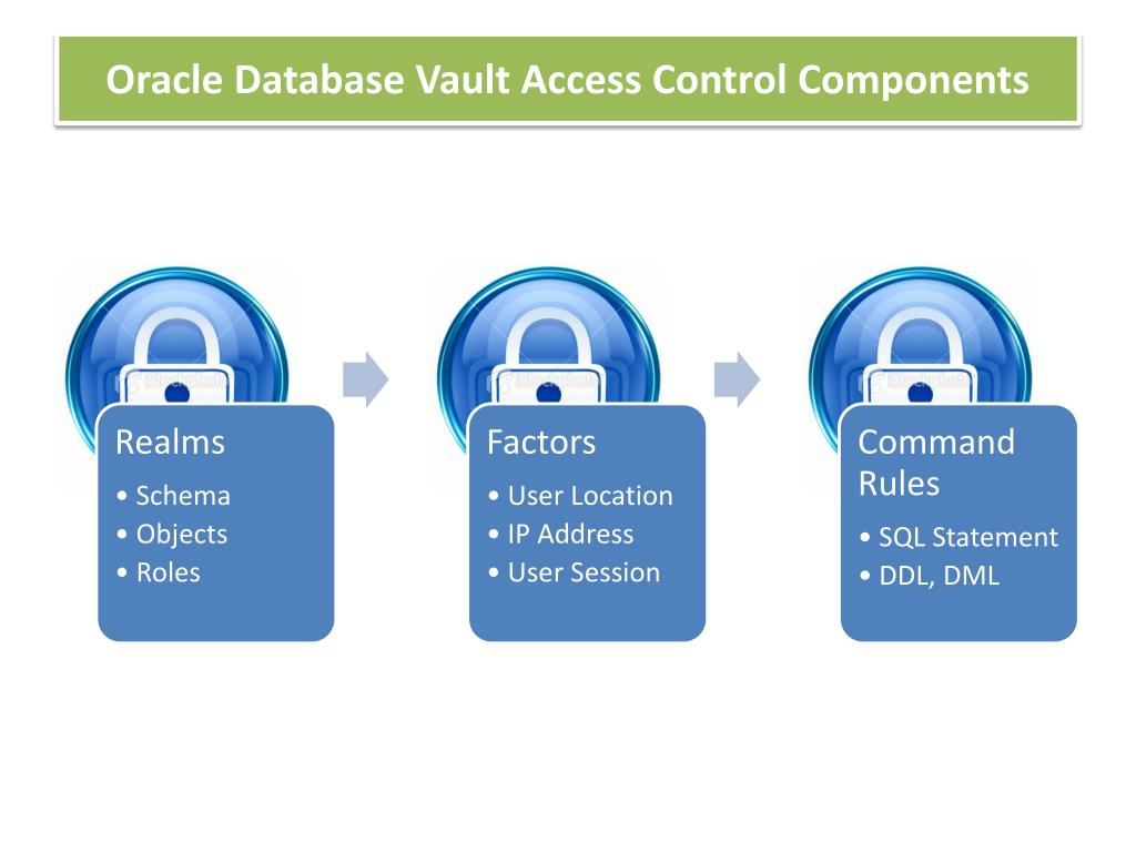 Components of Oracle Database Vault • Oracle Database Vault Access Control Components • Oracle Database Vault Administrator (DVA) • Oracle Database Vault Configuration Assistant (DVCA) • Oracle Database Vault DVSYS and DVF Schemas • Oracle Database Vault PL/SQL Interfaces and Packages • Oracle Database Vault and Oracle Label Security PL/SQL APIs • Oracle Database Vault Reporting and Monitoring Tools