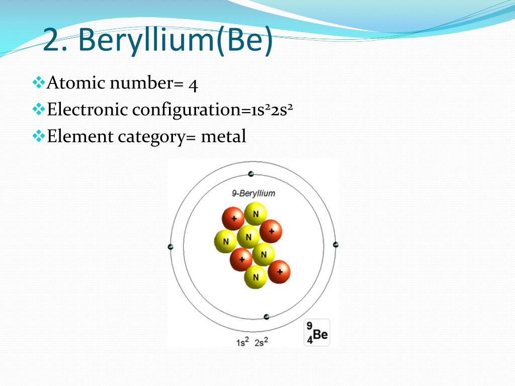 2. Beryllium(Be) • Atomic number= 4 • Electronic configuration=1s22s2 • Element category= metal