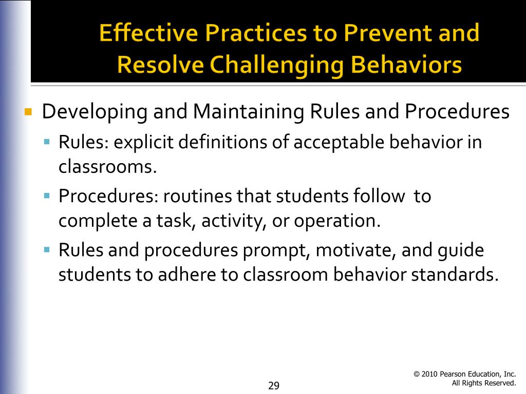 Effective Practices to Prevent and Resolve Challenging Behaviors • Developing and Maintaining Rules and Procedures • Rules: explicit definitions of acceptable behavior in classrooms. • Procedures: routines that students follow to complete a task, activity, or operation. • Rules and procedures prompt, motivate, and guide students to adhere to classroom behavior standards.