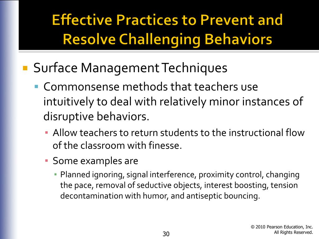 Effective Practices to Prevent and Resolve Challenging Behaviors • Surface Management Techniques • Commonsense methods that teachers use intuitively to deal with relatively minor instances of disruptive behaviors. • Allow teachers to return students to the instructional flow of the classroom with finesse. • Some examples are • Planned ignoring, signal interference, proximity control, changing the pace, removal of seductive objects, interest boosting, tension decontamination with humor, and antiseptic bouncing.