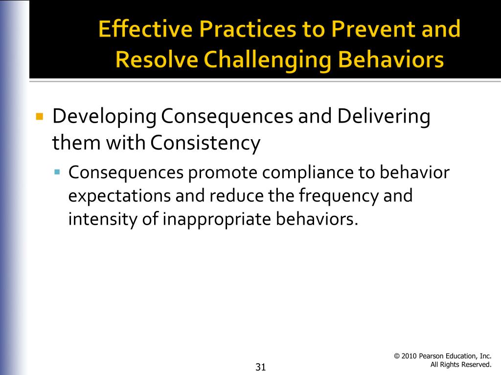 Effective Practices to Prevent and Resolve Challenging Behaviors • Developing Consequences and Delivering them with Consistency • Consequences promote compliance to behavior expectations and reduce the frequency and intensity of inappropriate behaviors.