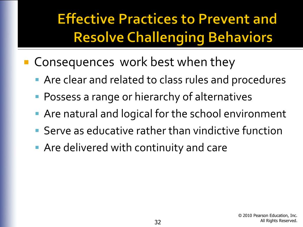 Effective Practices to Prevent and Resolve Challenging Behaviors • Consequences work best when they • Are clear and related to class rules and procedures • Possess a range or hierarchy of alternatives • Are natural and logical for the school environment • Serve as educative rather than vindictive function • Are delivered with continuity and care