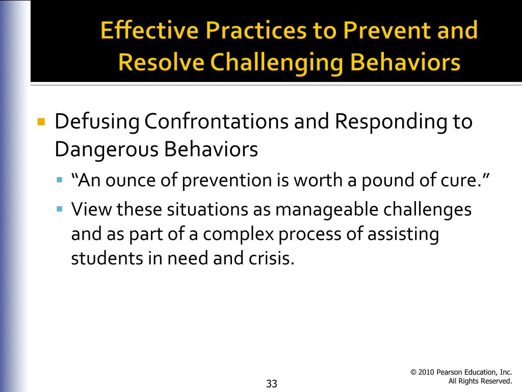 Effective Practices to Prevent and Resolve Challenging Behaviors • Defusing Confrontations and Responding to Dangerous Behaviors • “An ounce of prevention is worth a pound of cure.” • View these situations as manageable challenges and as part of a complex process of assisting students in need and crisis.