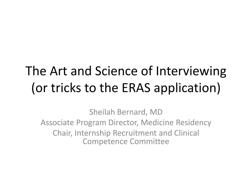 The Art and Science of Interviewing (or tricks to the ERAS application) Sheilah Bernard, MD Associate Program Director, Medicine Residency Chair, Internship Recruitment and Clinical Competence Committee